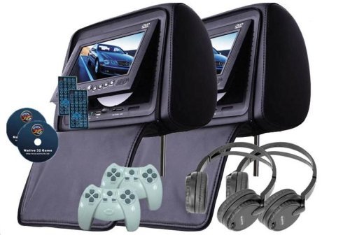 Black, New Headrest DVD Lcd Package with Wireless Controllers: No messy wires everywhere in your car anymore, your children will enjoy the games much more. Wireless IR headphones: You have the luxury to watch different movies without fights anymore! Phew! FM Transmitter: Easy to connect to your quality sound system on your car without hassle. AV in/out: It's just another convenient thing to connect your AV devices directly 7 inch Sharp TFT LCD screen: Now you can enjoy high quality movies/DVD with this SHARP screen with enough brightness. USB connectivity, SD/MMC/MS card reader: It provides you the convenience to link with the devices. Adjustable posts - easy installation: Fits all car seats without problem. they are set at 105mm apart and adjustable to 230mm. Contents: 2 x headrest 7" LCD monitor + 2 x all-region DVD player + 2 x DVD covers 2 x Game Discs 2 x Remote Controls 2 x Wireless Game controllers 2 x Wireless IR headphones English manuals Power and other wiring harness.